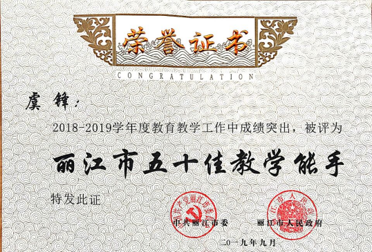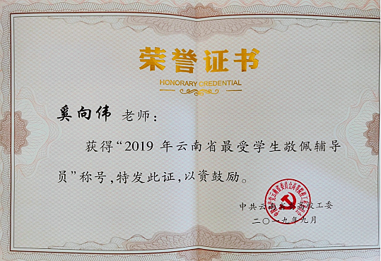 奚向伟老师荣获“2019年云南省最受学生敬佩辅导员”称号