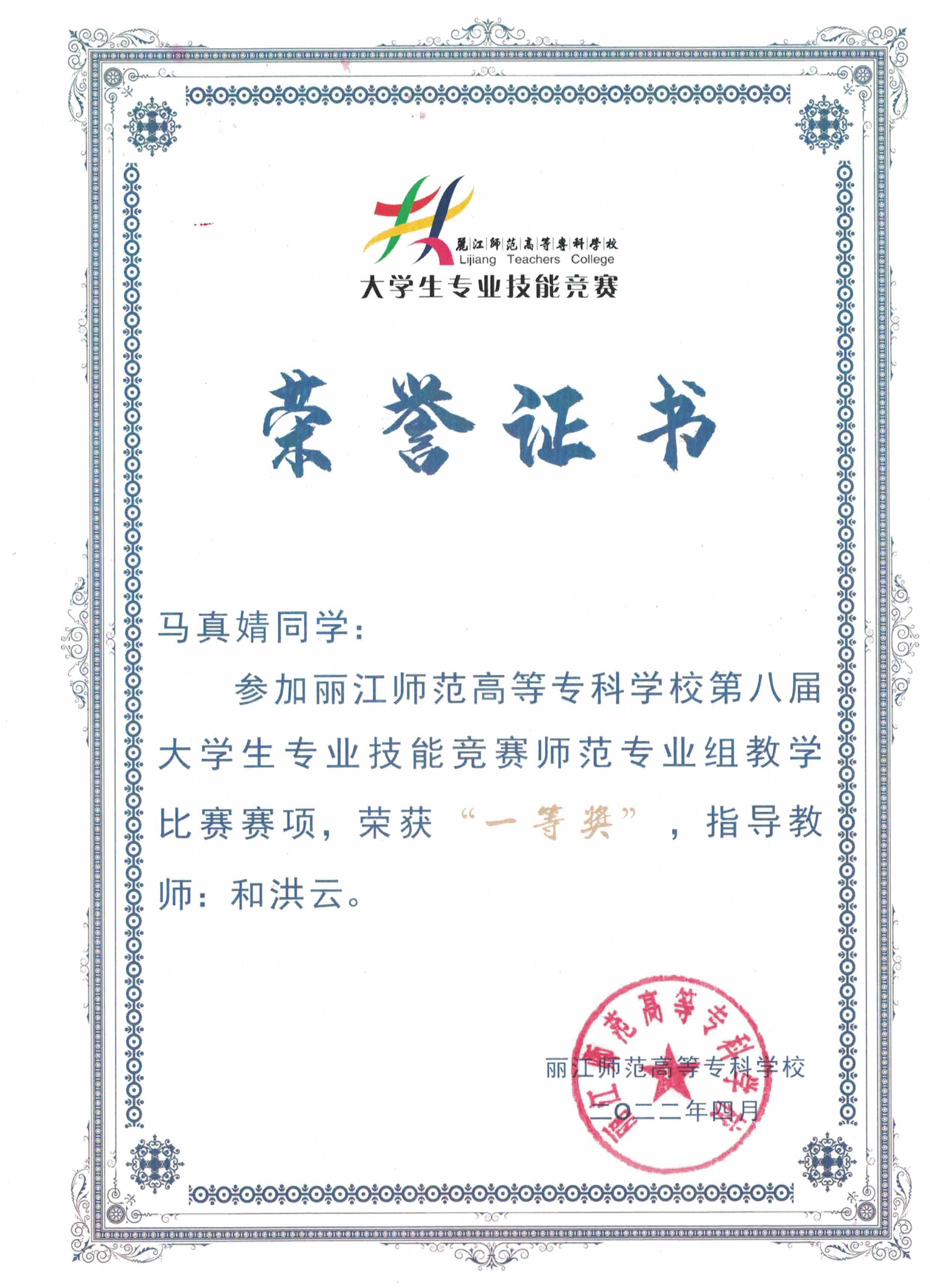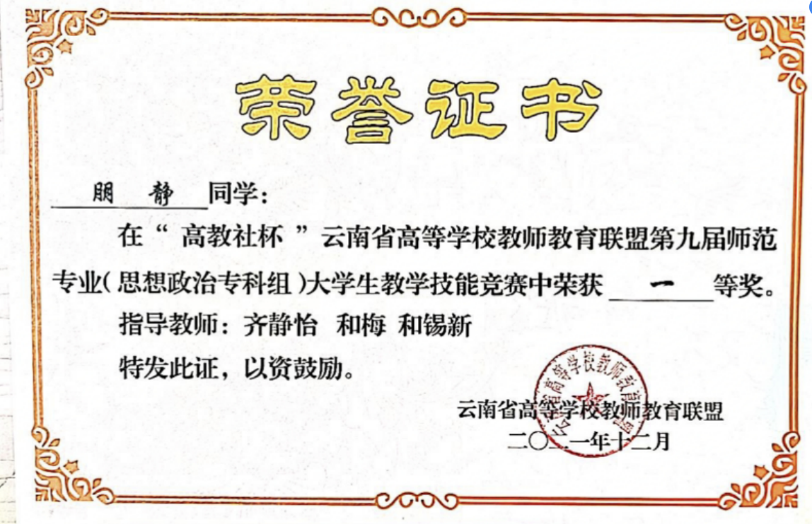 朋静同学荣获2021年云南省高等学校教师教育联盟师范专业大学生教学技能竞赛一等奖