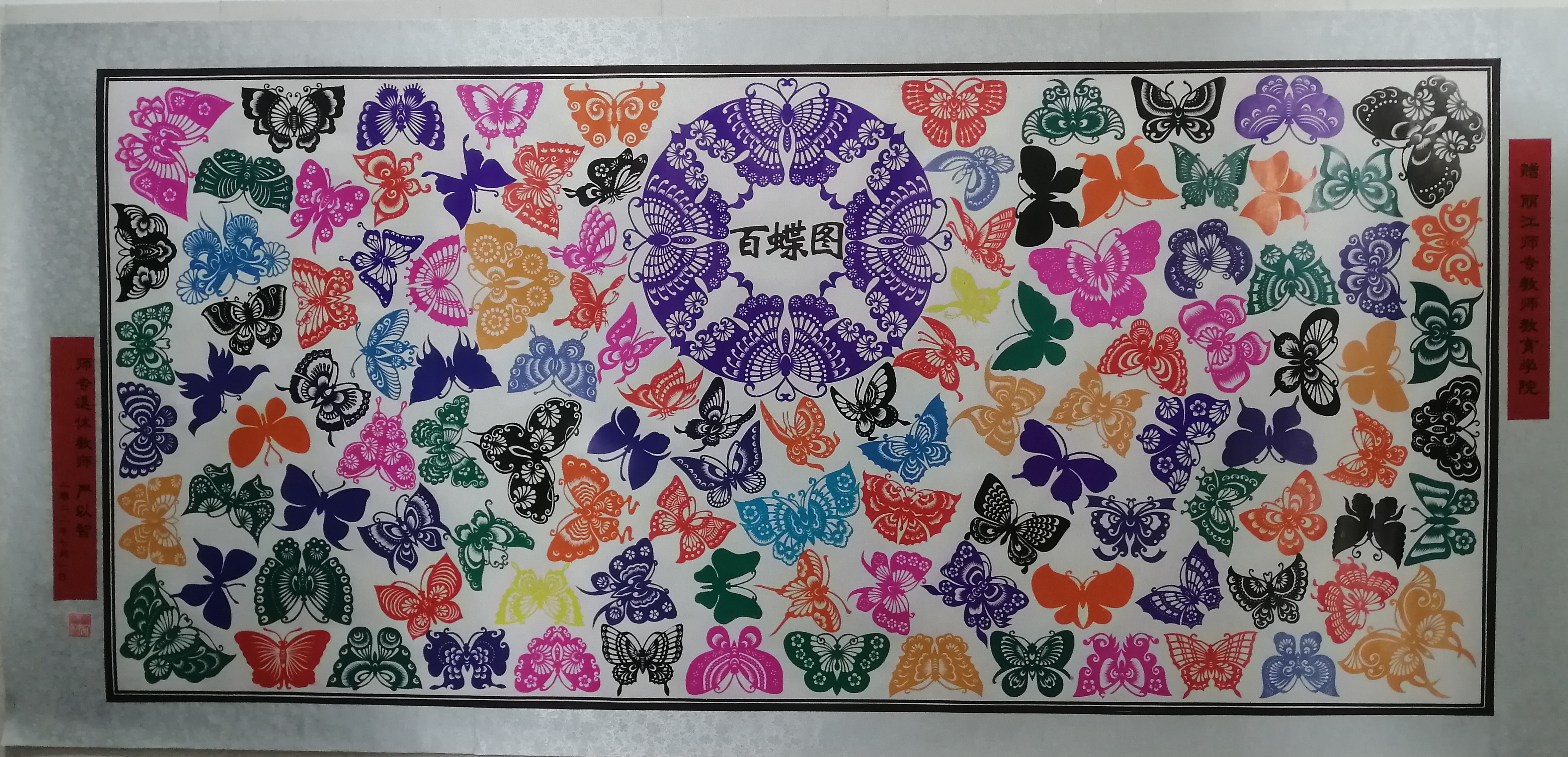 特别是严老师倾注心血送给教师教育学院的“百蝶图”,不仅生动形象,且百只蝴蝶绝无雷同,姿态各异,充分体现了严老师“非遗大师”精湛的技艺水平。