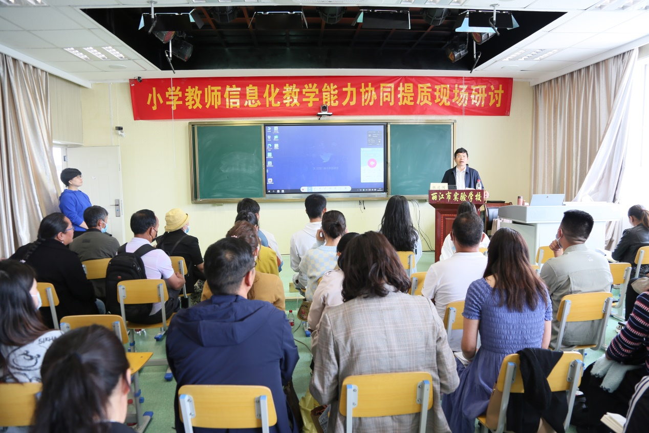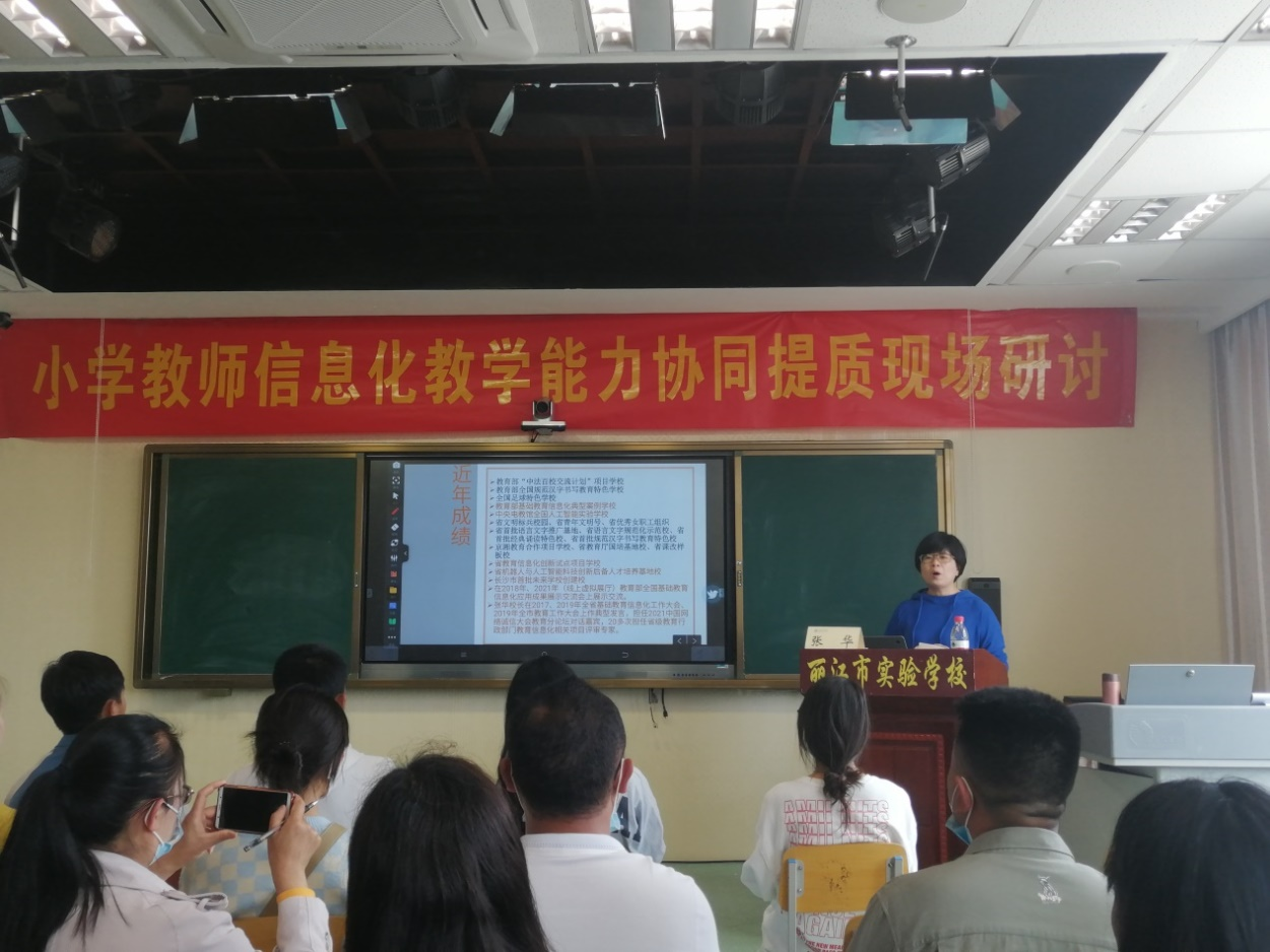 6月17日,为了践行我校服务地方基础教育的办学宗旨,贯彻《中国教育现代化2035》提出的“完善区域教育发展协作机制和教育对口支援机制,深入实施东西部协作,推动不同地区协同推进教育现代化”的目标要求,推动丽江市基础教育改革和现代化发展,提升丽江市小学教师信息化教学能力,由教育部四校援建单位长沙师范学院在我校挂职干部、《学前教育研究》编辑部主任张建国提议,长沙师范学院附属小学张华校长倾力相助,丽江师范高等专科学校教师教育学院主办,丽江市实验学校和丽江市教体局协办的“小学教师信息化教学能力协同提质现场研讨”活动顺利在丽江市实验学校开展。活动中长沙师范学院附属小学张华校长及其骨干教师团队的马笛、彭娜、何苗、张迎香老师分别带来了小学数学、语文、美术、道德与法治四节信息化教学典型案例,张华校长就信息化教学改革、信息化教学实施情况以及智慧校园建设做了详实的分享。根据疫情防控要求,现场参加此次活动的有丽江市四县一区的90余名骨干教师,通过线上推送共有6000多人同时观看了直播,丽江师专组织师生在教室同步观看并组织了研讨。这次信息化时代教学改革的活动给丽江市小学老师带来了巨大的震动,开阔了视野,增长了见识,引起了对自己利用信息技术开展教学方式的深刻反思。