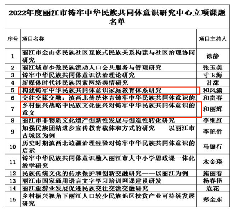 近日,收到中共丽江市委统战部、丽江市民族宗教事务局文件《关于做好2022年度丽江市铸牢中华民族共同体意识研究中心课题研究工作的通知》,本次丽江市铸牢中华民族共同体意识研究中心课题全市共立项24项,丽师共计立项15项,其中我院2项。(具体立项名单见下表)