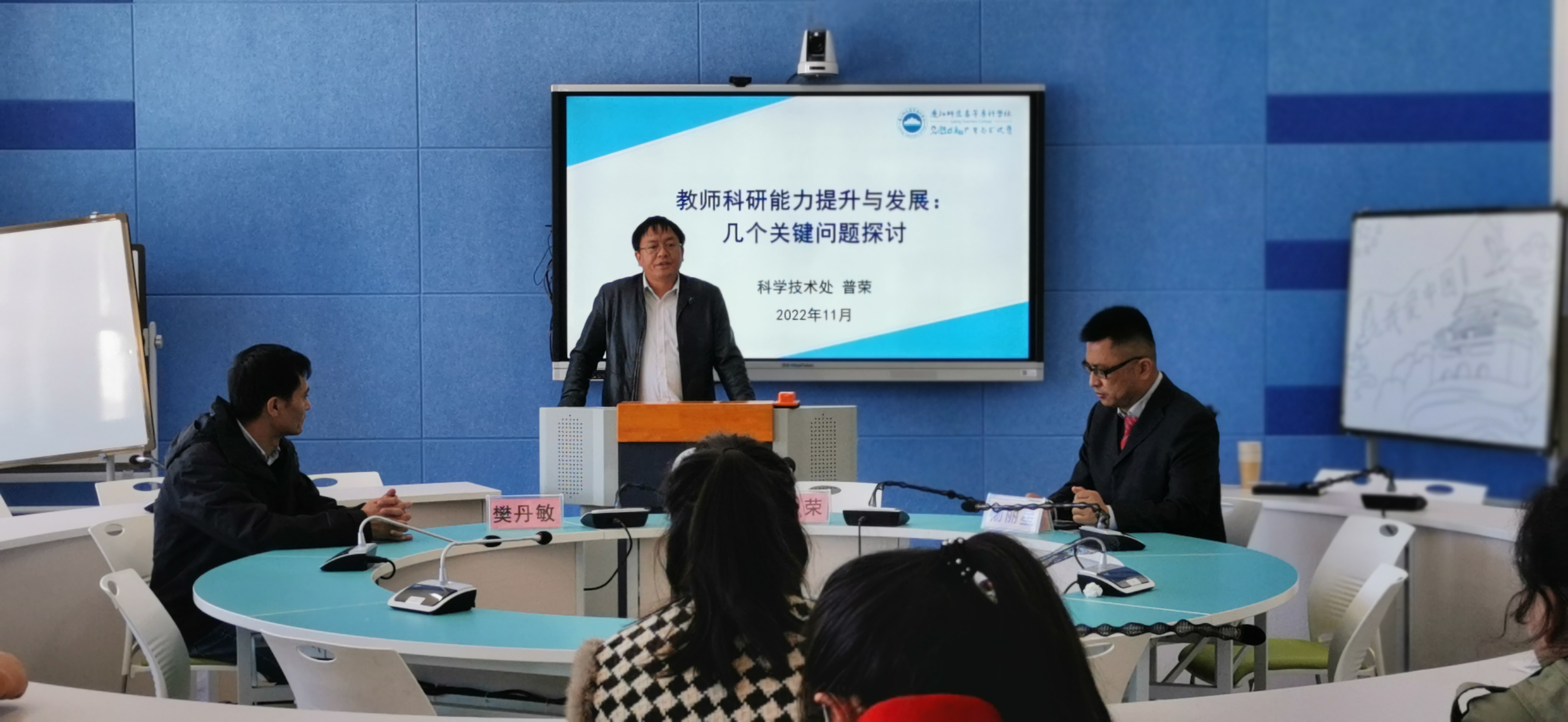 2022年11月2日下午,科技处处长普荣应邀到教师教育学院,在实训楼502作了题为“科研能力提升与发展:几个关键问题探讨”的讲座。讲座由教师教育学院院长杨丽星主持。教师教育学院50岁以下年轻教师参加了讲座。