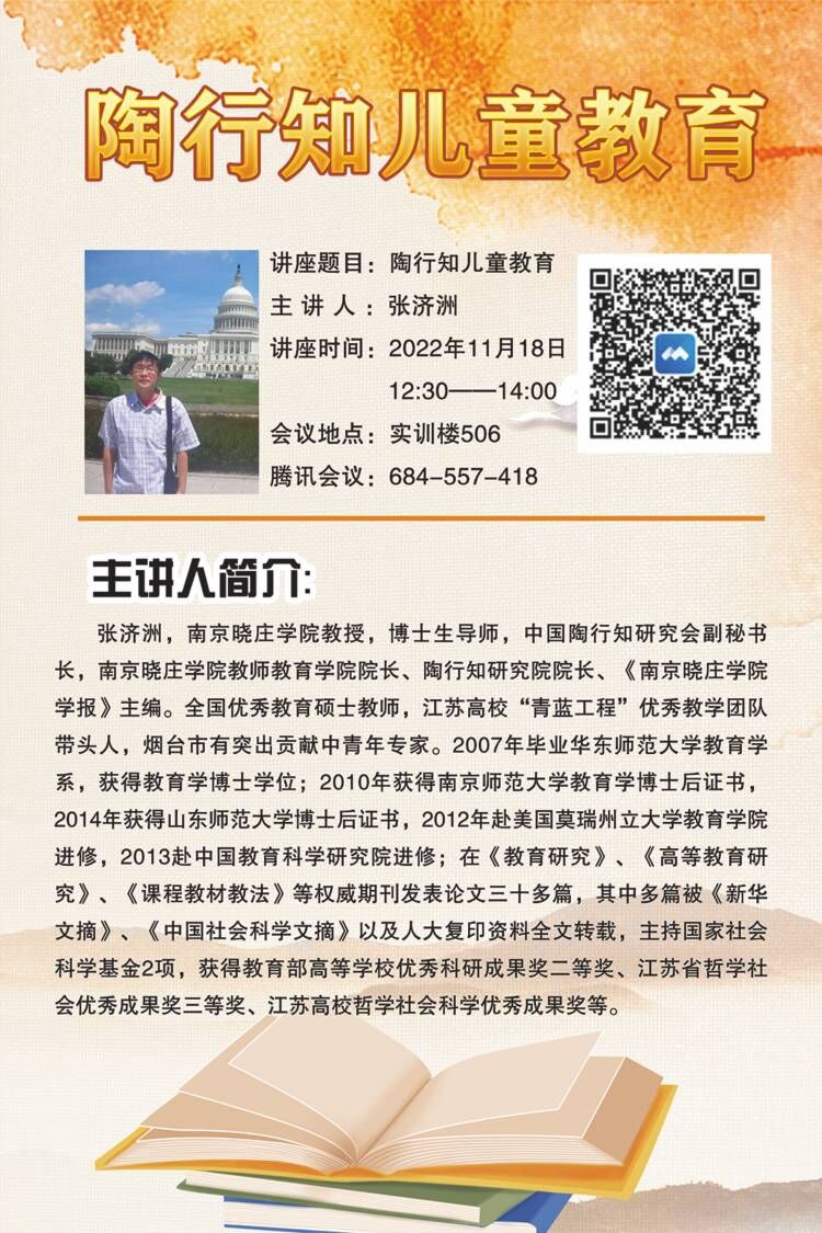 为进一步推进南京晓庄学院对口支援丽江师范高等专科学校,将援建工作推向纵深, 2022年11月18日,南京晓庄学院教师教育学院院长张济洲在线上为我校教师教育学院教师开展了“陶行知儿童教育”讲座。讲座由院长杨丽星主持。