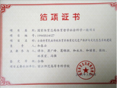 2015年9月,国家体育总局组织专家对2014年度国家体育总局体育哲学社会科学研究项目进行了结项评审,参评项目共158项。经评审,153项研究项目通过结项评审,其中优秀项目15项,合格项目138项。我校体育系和春云教授承担的2014年国家体育总局社会科学基金一般项目《云南特有民族传统体育非物质文化遗产保护与文化生态系统建设》(1996SS14027)顺利通过专家评审,获得成果鉴定等级“合格”,并颁发证书。