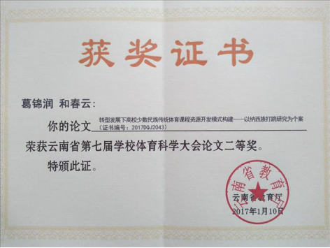 根据《云南省教育厅关于公布第七届学校体育科学大会论文评选结果的通知》(云教体[2017]1号)的情况通报,云南省第七届学校体育科学大会共征集到论文918篇,经组织专家进行“双盲”网上评审、集中会审、学术不端检测,最终评选出一等奖33篇(占4.5%),二等奖55篇(占7.7%),三等奖122篇(占17.2%)。我校葛锦润、和春云老师撰写的《转型发展下高校少数民族传统体育课程资源开发模式构建——以纳西族打跳研究为个案》荣获二等奖,这也是我校首次在云南省学校体育科学大会论文评选中获奖。