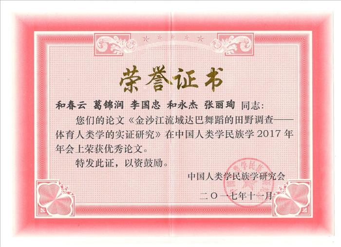 2017年11月10日至13日,我校教师教育学院和春云教授、葛锦润副教授应邀参加主题为“新时代中国人类学民族学学科体系建设”的中国人类学民族学2017年年会。大会在中南民族大学举行,来自清华大学、北京大学、中央民大、云南大学等120多所高校及科院所近500名专家学者参加了本次大会。在体育人类学专题会议上,和春云教授作了论文报告。大会共收到510篇论文,汇集了中国人类学民族学2017年度最新研究成果。经过各专业委员会专家评选推荐,组委会组织专家差额评审,一共评选出45篇年度优秀论文。我校和春云、葛锦润等撰写的《金沙江流域达巴舞蹈的田野调查——体育人类学的实证研究》荣列其中。该论文为本次大会全国地方专科院校唯一获奖的论文,也是云南体育人类学及民族传统体育学者首次获得的中国人类学民族研究领域的最高奖项