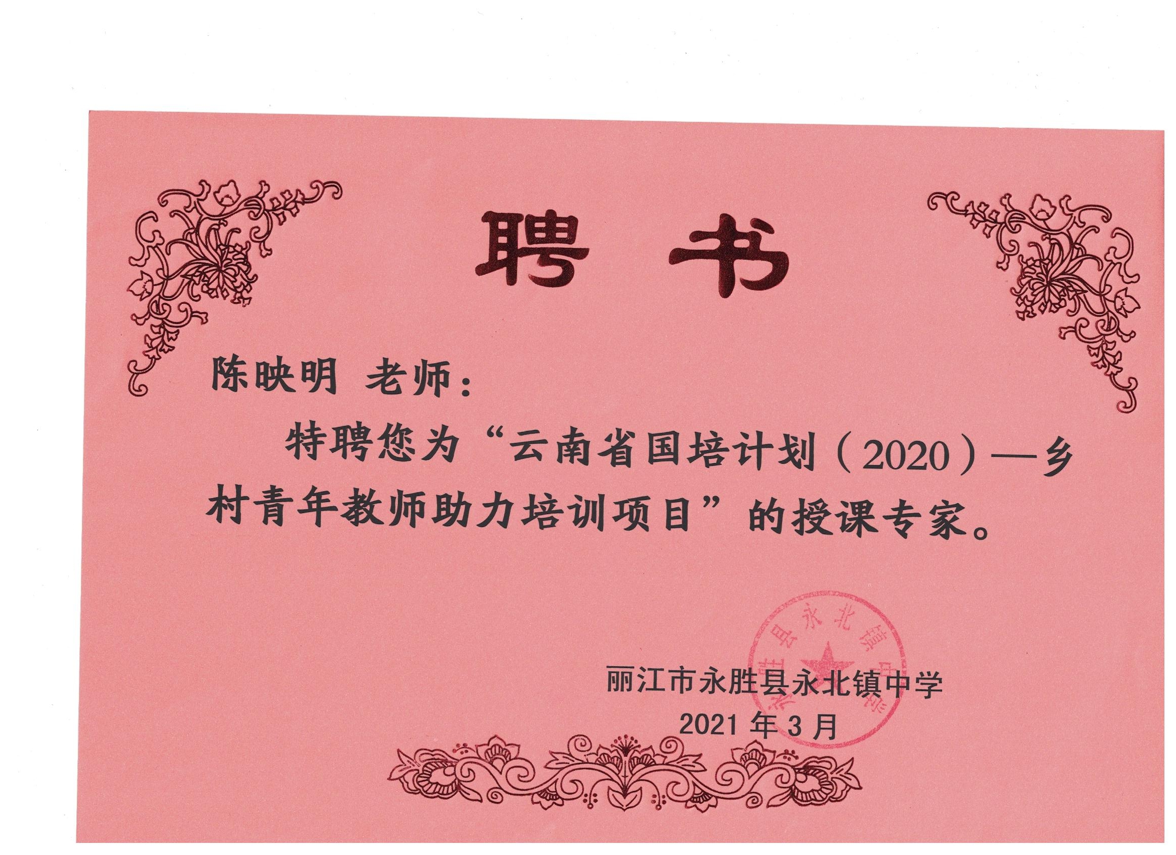 教师教育学院陈映明老师被丽江市永胜县永北镇中学聘为“云南省国培计划—乡村青年教师助力培训项目”授课专家。