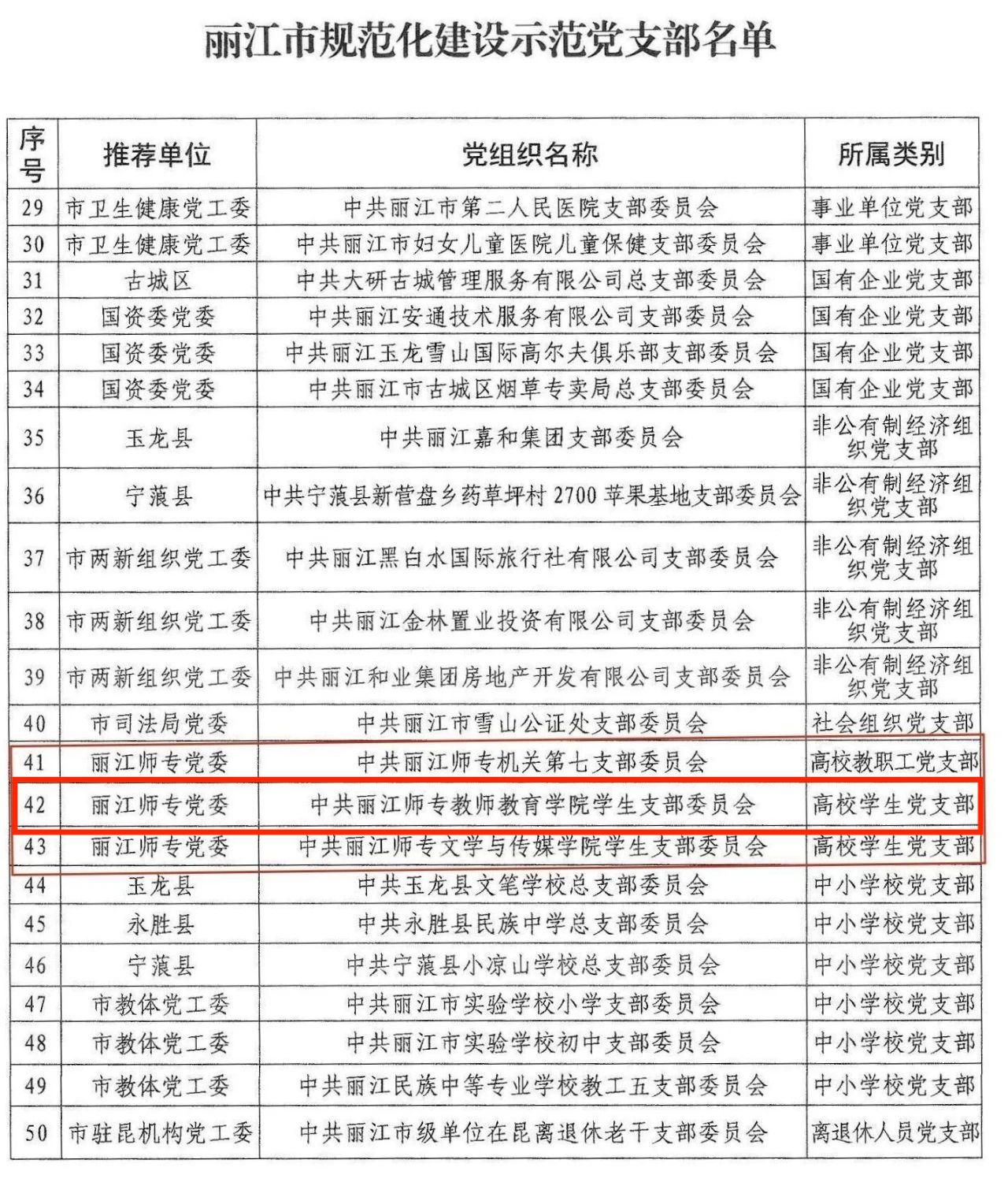 近日,中共丽江市委组织部公布“丽江市规范化建设示范党支部名单”,经学校基层党组织、校党委逐级验收推荐,市级抽验,我院学生党支部被命名为“丽江市规范化建设示范党支部”。