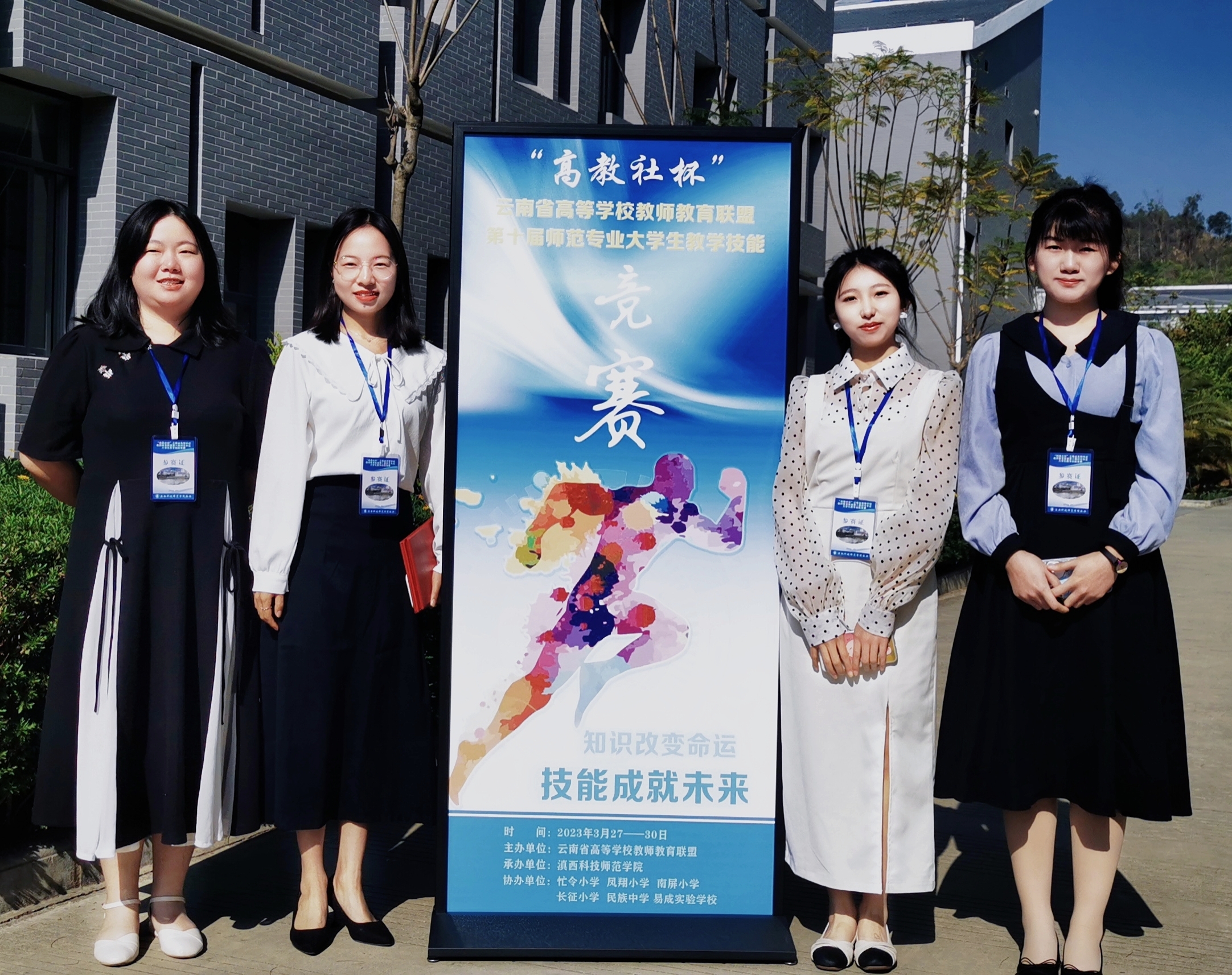 2023年3月28、29日,“高教社杯”云南省高等学校教师教育联盟第十届师范专业大学生教学技能大赛在临沧举办,我院派出2020级小学教育专业禄宏妍、袁思仪、张一雅、田紫彤四位同学参加现场赛。此次比赛由教研室主任夏桂云老师带队,经过两天的激烈角逐,禄宏妍同学斩获小学语文组一等奖,袁思仪、张一雅、田紫彤三位同学分获小学数学组和小学语文组二等奖的好成绩。