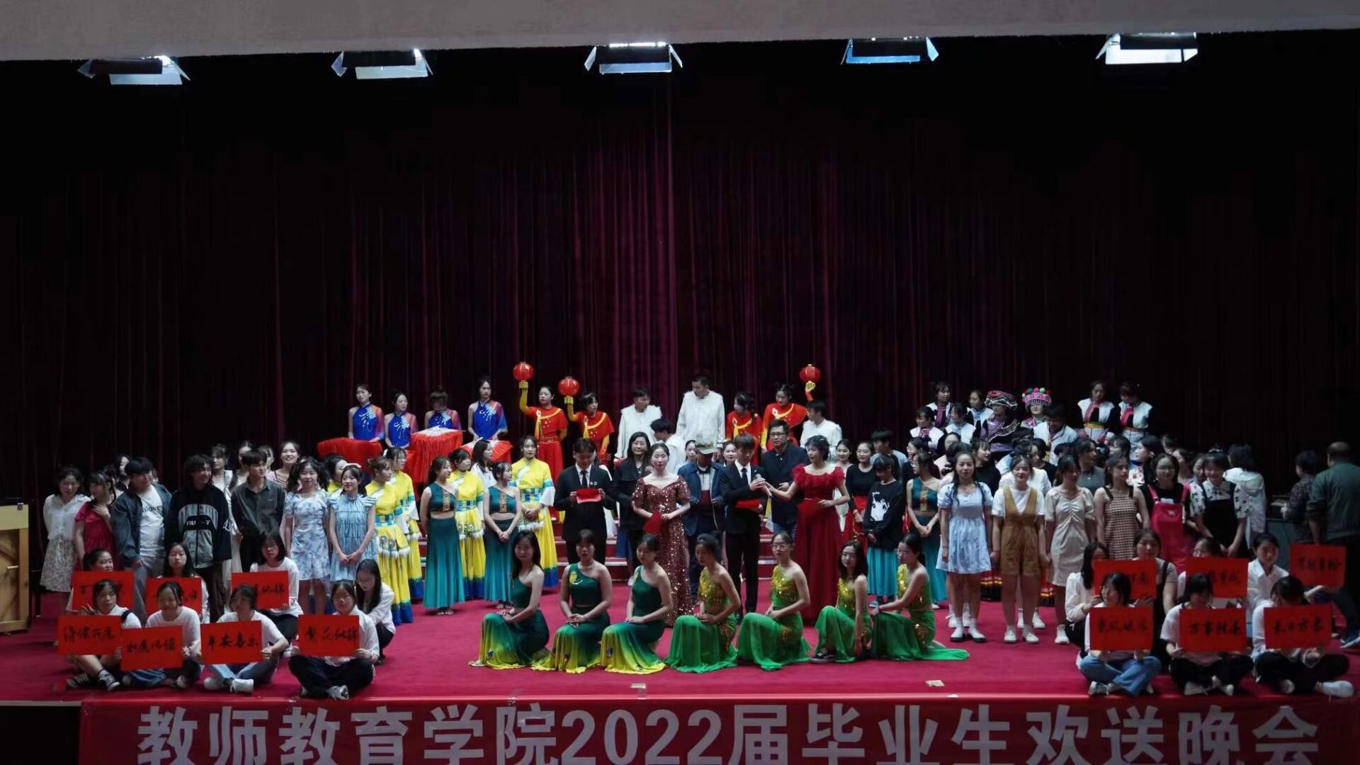 为欢送我院2022届毕业生,表达对毕业生的美好祝福,2022年6月9日晚上教师教育院在艺术楼演播厅举办了“教师教育学院2022届毕业生欢送晚会”,学院师生欢聚一堂,共同见证和记录了这个美丽而难忘的日子。由于疫情原因,许多毕业生无法到达现场参加欢送晚会,所以此次欢送晚会采取了线上线下同步直播的方式,让未能返校的学院学子也能共襄盛举。